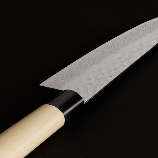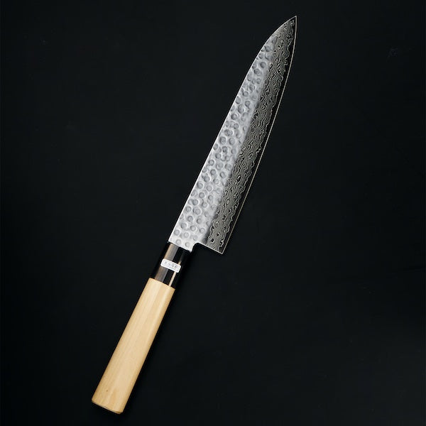 Discover the beauty and precision of our handcrafted Gyuto knife, expertly made in Seki City, Gifu Prefecture, Japan—one of the world's top cutlery production regions. This stunning knife features intricate ripples from its multi-layered Damascus steel, complemented by a unique “hammered eyes” finish, making it a true work of art for your kitchen.