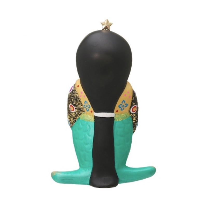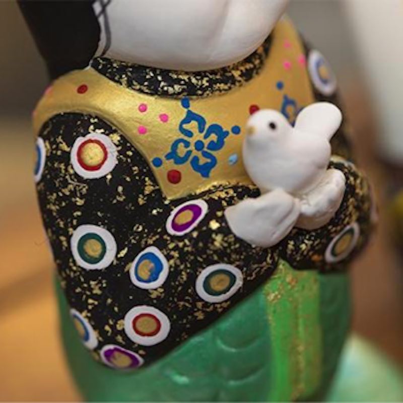 This doll is inspired by the siren used in Starbucks' logo, expressed in the style of traditional Gosho Ningyo (Palace Dolls). The doll, small enough to be held in your hand, features a rounded face and vibrant colors typical of Gosho Ningyo. A dove, symbolizing peace, is placed near its chest as a wish for everyone’s happiness. The clothing is carefully painted with traditional Japanese patterns, such as "Hebi-no-me" (serpent’s eye) and "Hishi" (diamond shape). The lower part of the doll is designed to resemble a mermaid's tail. This doll beautifully combines the unique aesthetics of Japan with the distinct characteristics of Kyoto’s Gosho Ningyo.